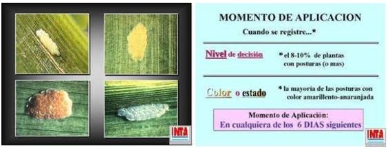 Si la mayoría de las oviposiciones son de color anaranjadas, se infiere que el grueso de las larvas comenzará a nacer entre las 24 y 48 horas siguientes. Considerando que las larvas penetran en el tallo a la semana de su nacimiento, el momento oportuno de control estará dentro de los 6 a 7 días posteriores a la detección de oviposiciones en su mayoría amarillento-anaranjadas (A-A). Conviene remarcar que una aplicación al inicio de esa ventana de una semana, posterior al registro de mayoría de posturas A-A, será una aplicación realizada en un momento tan oportuno como si se aplicara al final de dicha ventana de tiempo. Por lo tanto, el usuario podrá optar por el servicio de aplicación con la tranquilidad de un amplio rango de tiempo disponible; tan amplio que permitirá evitar un inminente riesgo de lluvia, a fin de asegurar la aplicación.