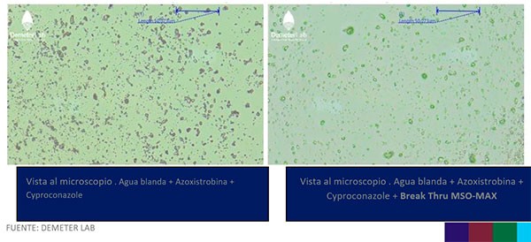 Para entender un poco mejor a los fungicidas: la mayoría de éstos son principios activos que en caldos de aplicación se presentan como cristales, porque poseen elevado punto de fusión y baja solubilidad en agua. El agregado Break-Thru MSO MAX mejora notablemente la disolución de dichos cristales y el contacto con las hojas, otorgando mayor disponibilidad inicial de activo y aumentando la residualidad de los tratamientos.