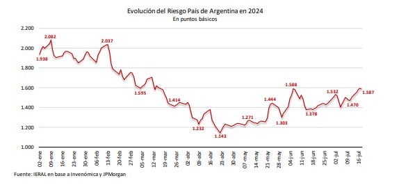 Los precios internacionales no están ayudando, desalentando las liquidaciones, ya que el poder adquisitivo de la soja en el mercado interno se ha achicado un 41,5 % entre noviembre de 2023 y julio de 2024, merma que es del 38,9 % para el caso del maíz y del 18,3 % para el trigo. Mientras tanto, un paliativo para la transición pasa por el blanqueo de capitales. En el gobierno estarían esperando una adhesión de entre 25 y 30 mil millones de dólares, y fuerte canalización hacia los depósitos, por lo que serían contabilizados en las reservas brutas del BCRA, que incluyen los encajes bancarios. Aunque no se trata de reservas propias, los encajes han sido utilizados en el pasado cercano como una especie de “colateral” para afrontar compromisos de corto plazo. Sin embargo, para reducir el elevadísimo riesgo país sería necesario recuperar reservas netas, una tarea que las últimas medidas hacen más incierta, partiendo desde un rojo actual del orden de los 4,0 mil millones de dólares (computando BOPREAL). El riesgo país no es un indicador que involucre exclusivamente al sector externo. Si bien con la vigencia del cepo los vasos comunicantes entre deuda externa y doméstica están parcialmente obturados, esa conexión no desaparece, e influye sobre las expectativas.