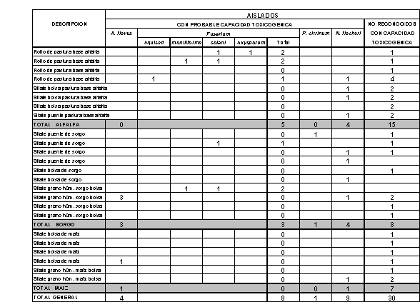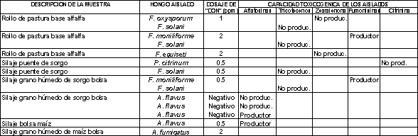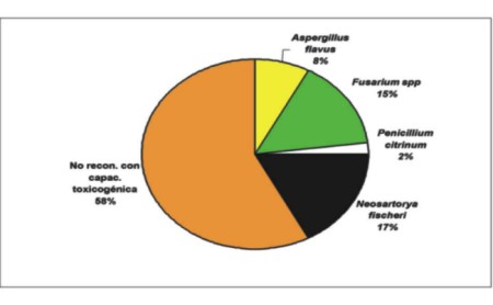 En dos muestras se observó contaminación con Aspergillus fumigatus, que es un hongo reconocido por su capacidad patogénica (no toxicogénica) tanto para el hombre como para los animales que lo ingieren, por ocasionar micosis pulmonares.