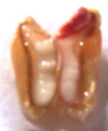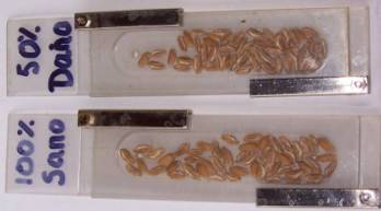 1- Se cortan 50 granos de trigo por la mitad, una de las mitades se coloca en una cubeta y la otra se desecha. En la foto se puede observar como debe quedar el corte (Izquierda) y dos cubetas llenas con medios granos (Derecha).