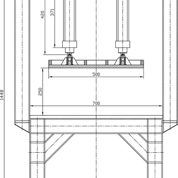 La superficie de trabajo es de 500x500 milímetros, siendo la mesa receptora mayor, de 700x700 milímetros. El recorrido de la placa de prensado es de 250 milímetros.
