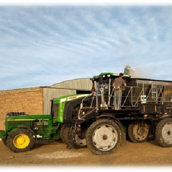 El sistema de fertilización opera con tolva de 4.000 litros construida en chapa de acero inoxidable y rejilla protectora de impurezas y balanza de carga.