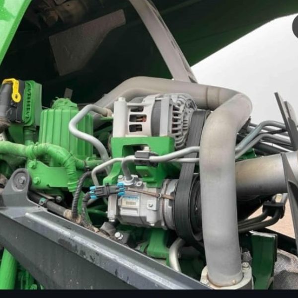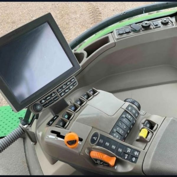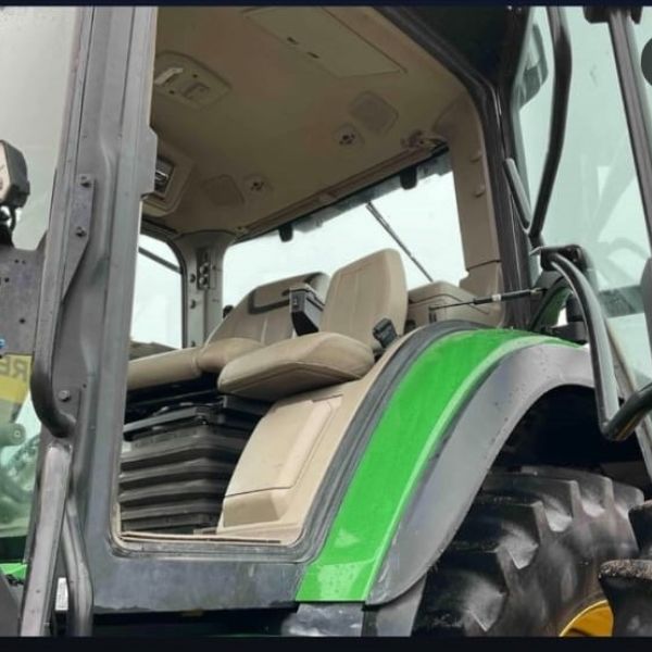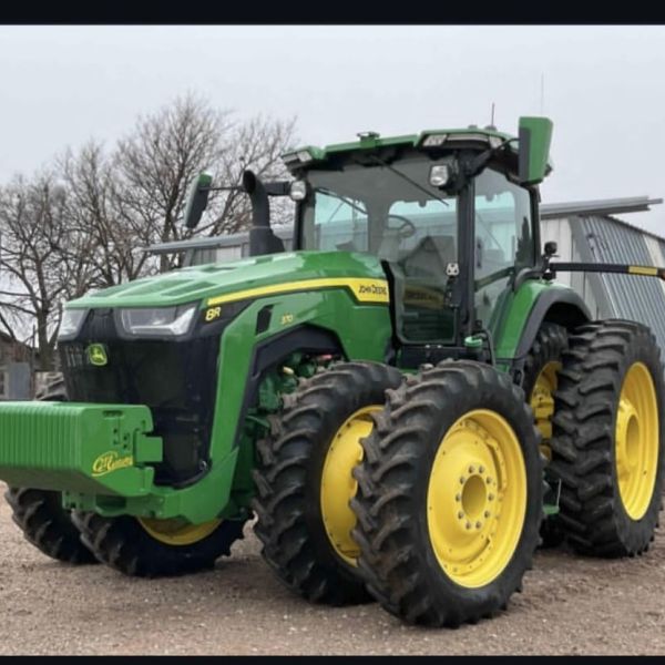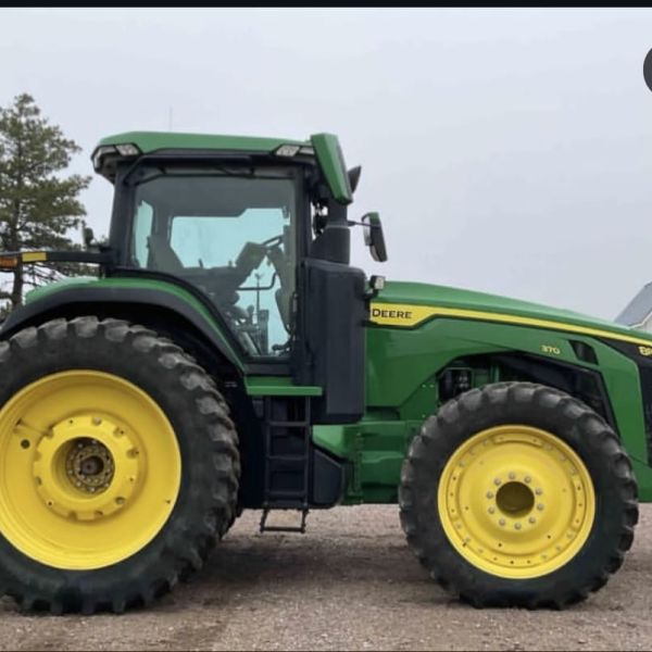 Tractor John Deere 8R 370 MFWD año 2020, con 2,573 horas mostradas, motor John Deere 9L diésel de 6 cilindros, transmisión IVT, 6 salidas hidráulicas, enganche de 3 puntos con Quick Hitch, neumáticos delanteros 380/80R38, neumáticos traseros 480/80R50, duales delanteras y traseras, 22 contrapesos frontales John Deere Suitcase, TDF (PTO).