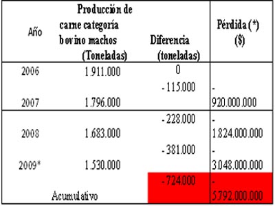 Si calculamos a partir del 2006 –tomando este año como inicio de las intevenciones del Gobierno- la producción de carne de la categoría machos y la evaluamos en dinero, la pérdida para el país fue de 5.792 millones de pesos (Cuadro 1).