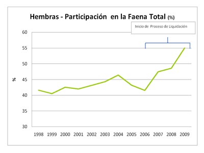 En Argentina si tenemos en cuenta la participación de la hembra en la faena (Gráfico 4), observaremos como no hay duda que estamos –a partir del 2007- en plena proceso de liquidación.