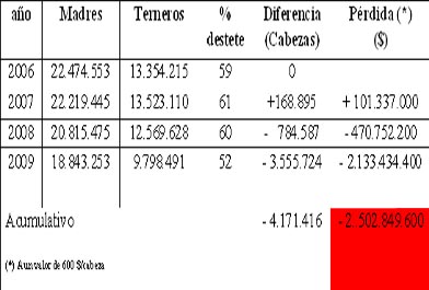 tuvimos que echar manos a las vaquillonas y ternera –futura madres-. Si evaluamos la pérdida en dinero por esta acción de faenar las futuras madres, el país perdió a partir del 2006, 6.242 millones de pesos.