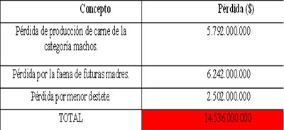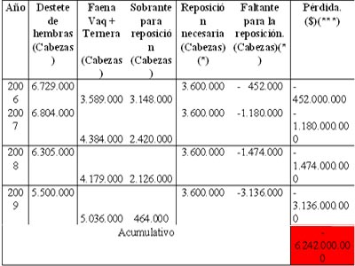 - La no reposición de las vacas madres de rechazo –al tener que faenar as futuras madres- le produce una pérdida en la producción de terneros al país. El dinero perdido por esta acción desde el 2006 es de 2.502 millones de pesos.