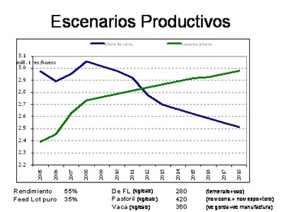 - Si hacemos un escenario probable con todas estas variables (Gráfico 6), no hay duda que la Argentina a partir del 2011 deberá –siguiendo con el mismo consumo per cápita- importar carne.