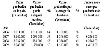 Este aumento de la producción de carne proveniente de la categoría de hembras se hizo en base a una mayor faena de vaquillonas y terneras (Cuadro 3), originando un saldo negativo para la reemplazo de la vacas de rechazos, en la cual se tuvo en cuenta solo el 15 % de reposición, es decir con envejecimiento del rodeo.