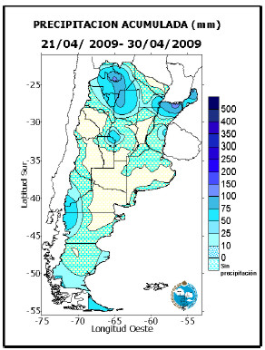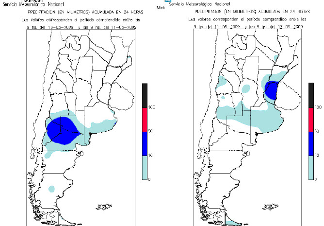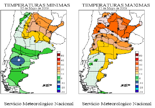 CENTRO Y ESTE DE SALTA, CENTRO Y ESTE DE JUJUY Y TUCUMÁN NUBOSIDAD VARIABLE. VIENTOS LEVES DEL SECTOR ESTE. TEMPERATURA MÍNIMA ENTRE 10ºC Y13ºC. TEMPERATURA MÁXIMA ENTRE 7ºC Y 10ºC. MISIONES NUBOSIDAD VARIABLE. TIEMPO INESTABLE DURANTE LA MAÑANA. VIENTOS LEVES DEL SECTOR SUR, LUEGO DE DIRECCIONES VARIABLES . TEMPERATURA MÍNIMA ENTRE 6ºC Y 10ºC. TEMPERATURA MÁXIMA ENTRE 15ºC Y 17ºC. CORRIENTES, FORMOSA, CHACO, CENTRO Y NORTE DE SANTA FE PROBABILIDAD DE HELADAS. NUBOSIDAD VARIABLE, LUEGO CIELO ALGO NUBLADO. VIENTOS LEVES DE DIRECCIONES VARIABLES, PREVALECIENTES DEL SECTOR ESTE. TEMPERATURA MÍNIMA ENTRE 2ºC Y 7ºC. TEMPERATURA MÁXIMA ENTRE16ºC Y 18ºC. ENTRE RÍOS PROBABILIDAD DE HELADAS. CIELO ALGO NUBLADO. VIENTOS LEVES DE DIRECCIONES VARIABLES, PREVALECIENTES DEL SECTOR OESTE. TEMPERATURA MÍNIMA ENTRE 1ºC Y 3ºC. TEMPERATURA MÁXIMA ENTRE16ºC Y 18ºC. NORTE DE CÓRDOBA Y SANTIAGO DEL ESTERO CIELO PARCIALMENTE NUBLADO. VIENTOS LEVES DEL SECTOR NORTE. TEMPERATURA MÍNIMA ENTRE 6ºC Y 11ºC. TEMPERATURA MÁXIMA ENTRE 18ºC Y 20ºC. NORESTE DE BUENOS AIRES PROBABILIDAD DE ALGUNAS HELADAS AISLADAS. CIELO PARCIALMENTE O ALGO NUBLADO. VIENTOS MODERADOS A LEVES DEL SUDOESTE, CAMBIANDO A LEVES DEL OESTE. TEMPERATURA MÍNIMA ENTRE 2ºC Y 6ºC. TEMPERATURA MÁXIMA ENTRE 13ºC Y 16ºC. SUR DE CORDOBA, SAN LUIS Y NORESTE DE LA PAMPA PROBABILIDAD DE ALGUNAS HELADAS AISLADAS. NUBOSIDAD VARIABLE, LUEGO PARCIALMENTE NUBLADO. VIENTOS LEVES DEL SECTOR NORTE. TEMPERATURA MÍNIMA ENTRE 3ºC Y 6ºC. TEMPERATURA MÁXIMA ENTRE 17ºC Y 19ºC. SUR DE SANTA FE, CENTRO Y NOROESTE DE BUENOS AIRES PROBABILIDAD DE HELADAS. CIELO ALGO NUBLADO. VIENTOS LEVES DE DIRECCIONES VARIABLES, LUEGO DEL SECTOR NORTE. TEMPERATURA MÍNIMA ENTRE -1ºC Y 3ºC. TEMPERATURA MÁXIMA ENTRE 13ºC Y 16ºC. SUDOESTE DE BUENOS AIRES, CENTRO Y SUR DE LA PAMPA PROBABILIDAD DE HELADAS. NUBOSIDAD VARIABLE. VIENTOS LEVES DE DIRECCIONES VARIABLES, LUEGO DEL NOROESTE. TEMPERATURA MÍNIMA ENTRE 0ºC Y 3ºC. TEMPERATURA MÁXIMA ENTRE 13ºC Y 16ºC. SUDESTE DE BUENOS AIRES PROBABILIDAD DE HELADAS. CIELO ALGO NUBLADO, LUEGO NUBOSIDAD VARIABLE. VIENTOS LEVES DEL SECTOR OESTE. TEMPERATURA MÍNIMA ENTRE 1ºC Y 8ºC. TEMPERATURA MÁXIMA ENTRE 14ºC Y 16ºC.