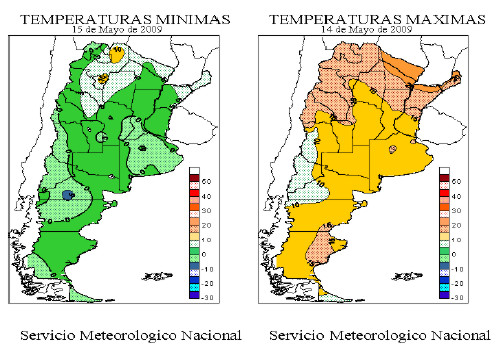 CENTRO Y ESTE DE SALTA, ESTE DE JUJUY Y TUCUMÁN CIELO ALGO A PARCIALMENTE NUBLADO. VIENTOS LEVES DEL SECTOR NORTE, ROTANDO AL SECTOR ESTE. TEMPERATURA MÍNIMA ENTRE 8ºC Y 10ºC. TEMPERATURA MÁXIMA ENTRE 21ºC Y 26ºC. SANTIAGO DEL ESTERO, CENTRO Y OESTE DE CHACO, CENTRO Y OESTE DE FORMOSA, NORTE DE SANTA FE Y SUR DE CORRIENTES CIELO ALGO NUBLADO. VIENTOS LEVES DEL SECTOR NORTE, ROTANDO AL NORESTE. TEMPERATURA MÍNIMA ENTRE 4ºC Y 9ºC. TEMPERATURA MÁXIMA ENTRE 21ºC Y 24ºC. MISIONES CIELO ALGO NUBLADO. VIENTOS LEVES DEL NORESTE . TEMP. MÍNIMA ENTRE 6ºC Y 9ºC. TEMP. MÁXIMA ENTRE 23ºC Y 24ºC. NORTE DE CORRIENTES, ESTE DE CHACO Y ESTE DE FORMOSA PROBABILIDAD DE HELADAS. CIELO ALGO NUBLADO. VIENTOS LEVES DEL NORESTE. TEMPERATURA MÍNIMA ENTRE 2ºC Y 4ºC. TEMPERATURA MÁXIMA ENTRE 22ºC Y 24ºC. CENTRO Y SUR DE SANTA FE Y ENTRE RIOS CIELO ALGO O PARCIALMENTE NUBLADO. VIENTOS LEVES DEL SECTOR NORTE, CAMBIANDO AL SECTOR ESTE. TEMPERATURA MÍNIMA ENTRE 4ºC Y 7ºC. TEMPERATURA MÁXIMA ENTRE 20ºC Y 22ºC. NORESTE DE BUENOS AIRES CIELO PARCIALMENTE NUBLADO O NUBLADO. VIENTOS MODERADOS A LEVES DEL SECTOR NORTE, CAMBIANDO AL SECTOR SUR HACIA LA NOCHE.. TEMPERATURA MÍNIMA ENTRE 7ºC Y 10ºC. TEMPERATURA MÁXIMA ENTRE 17ºC Y 19ºC. CORDOBA Y SAN LUIS CIELO ALGO O PARCIALMENTE NUBLADO. VIENTOS LEVES DEL SECTOR NORTE, CAMBIANDO AL SUDESTE. TEMPERATURA MÍNIMA ENTRE 7ºC Y 10ºC. TEMPERATURA MÁXIMA ENTRE 18ºC Y 21ºC. NOROESTE DE BUENOS AIRES CIELO PARCIALMENTE NUBLADO O NUBLADO. VIENTOS LEVES MODERADOS DEL NOROESTE, CAMBIANDO AL SECTOR SUR. TEMPERATURA MÍNIMA ENTRE 6ºC Y 9ºC. TEMPERATURA MÁXIMA ENTRE 16ºC Y 19ºC. SUDESTE DE BUENOS AIRES CIELO NUBLADO, LUEGO NUBOSIDAD VARIABLE. VIENTOS LEVES A MODERADOS DEL NOROESTE, CAMBIANDO AL SUDESTE. TEMPERATURA MÍNIMA ENTRE 7ºC Y 11ºC. TEMPERATURA MÁXIMA ENTRE 16ºC Y 18ºC. SUDOESTE DE BUENOS AIRES Y LA PAMPA CIELO NUBLADO O PARCIALMENTE NUBLADO. VIENTOS MODERADOS A LEVES DEL SECTOR OESTE, LUEGO DE DIRECCIONES VARIABLES. TEMPERATURA MÍNIMA ENTRE 7ºC Y 11ºC. TEMPERATURA MÁXIMA ENTRE 15ºC Y 19ºC.