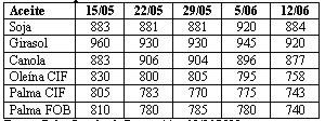 Para los analistas los precios de los aceites por causa de la gran demanda de estas mercaderías y por el grado de sustitución entre las mismas, tendió a reducir las paridades entre los aceites. De echo, se ha reducido la dispersión de precios entre los mismos que se ubicaron todos en un rango estrecho entre 750 a 950 u$s/t.