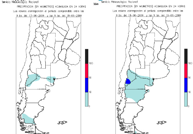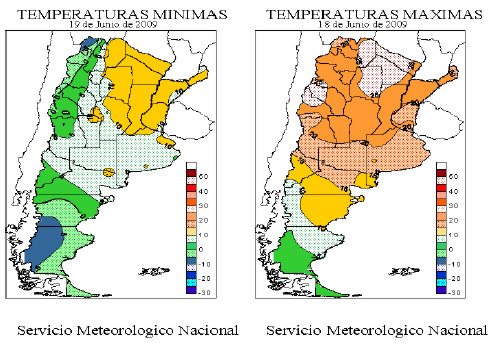 TUCUMÁN, ESTE DE SALTA Y ESTE DE JUJUY, EXTREMOS OESTE DE FORMOSA Y CHACO NUBLADO, LUEGO NUBOSIDAD VARIABLE. PROBABLES LLOVIZNAS POR LA MAÑANA. MEJORANDO POR LA TARDE. VIENTOS LEVES DEL SECTOR SUR. TEMPERATURA MÍNIMA ENTRE 7ºC Y 13ºC. TEMPERATURA MÁXIMA 15ºC. CENTRO Y ESTE DE FORMOSA, CENTRO Y ESTE DE CHACO , CORRIENTES NUBLADO, LUEGO NUBOSDIAD VARIABLE. PROBABILDAD DE PRECIPITACIONES POR LA MAÑANA. MEJORANDO POR LA TARDE. VIENTOS LEVES DEL SECTOR NORTE ROTANDO AL SECTOR SUR. TEMPERATURA MÍNIMA 15ºC. TEMPERATURA MÁXIMA 20ºC. SANTIAGO DEL ESTERO, NORTE Y CENTRO DE SANTA FE, NORTE DE CÓRDOBA, ENTRE RÍOS NUBLADO A PARCIALMENTE NUBLADO. VIENTOS LEVES DEL SECTOR SUR. TEMPERATURA MÍNIMA ENTRE 6ºC Y 12ºC. TEMPERATURA MÁXIMA ENTRE 12ºC Y 17ºC. MISIONES NUBLADO. PROBABILIDAD DE LLUVIAS Y TORMENTAS. VIENTOS LEVES DEL SECTOR NORTE. TEMPERATURA MÍNIMA ENTRE 15ºC Y 18ºC. TEMPERATURA MÁXIMA ENTRE 20ºC Y 22ºC. NORTE DE SAN LUIS PARCIALMENTER NUBLADO. VIENTOS LEVES DEL SECTOR ESTE. PROBABILIDAD DE HELADAS AISLADAS. TEMPERATURA MÍNIMA ENTRE 3ºC Y 5ºC. TEMPERATURA MÁXIMA 10ºC. SUR DE SANTA FE, SUR DE SAN LUIS, CENTRO Y NORTE DE LA PAMPA, SUR DE CÓRDOBA, NOROESTE, CENTRO Y SUDOESTE DE BUENOS AIRES CIELO DE ALGO A PARCIALMENTE NUBLADO. EN BUENOS AIRES Y LA PAMPA VIENTOS LEVES DEL SECTOR OESTE, EN EL RESTO DE LA REGIÓN LEVES DEL SECTOR SUR. PROBABILIDAD DE HELADAS AISLADAS. TEMPERATURA MÍNIMA ENTRE 3ºC Y 8ºC. TEMPERATURA MÁXIMA ENTRE 11ºC Y 15ºC. NORESTE DE BUENOS AIRES NUBOSIDAD VARIABLE. VIENTOS LEVES DE DIRECCIONES VARIABLES PREVALECIENDO DEL SECTOR SUR, ROTANDO AL SECTOR ESTE. PROBABILIDAD DE HELADAS AISLADAS. TEMPERATURA MÍNIMA ENTRE 3ºC Y 6ºC. TEMPERATURA MÁXIMA 13ºC. SUR DE LA PAMPA Y EXTREMO SUR DE BUENOS AIRES PROBABILIDAD DE HELADAS AISLADAS. CIELO ALGO NUBLADO. VIENTOS MODERADOS DEL SECTOR OESTE. TEMPERATURA MÍNIMA ENTRE 0ºC Y 5ºC. TEMPERATURA MÁXIMA ENTRE 8ºC Y 10ºC. COSTA SUDESTE DE BUENOS AIRES ALGO A PARCIALMENTE NUBLADO. VIENTOS LEVES A MODERADOS DEL SECTOR OESTE. PROBABILIDAD DE HELADAS AISLADAS. TEMPERATURA MÍNIMA ENTRE 3ºC Y 8ºC. TEMPERATURA MÁXIMA 13ºC.
