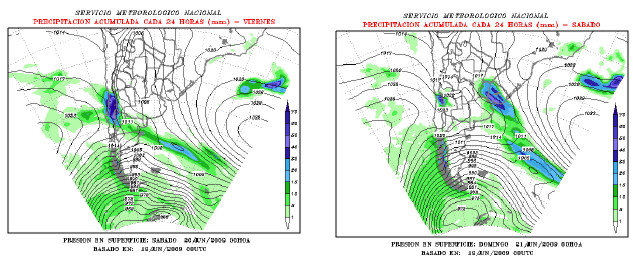 ESTE DE SALTA, ESTE DE JUJUY, TUCUMÁN, EXTREMO OESTE DE CHACO Y EXTREMO OESTE DE FORMOSA, SANTIAGO DEL ESTERO NUBLADO. PROBABILIDAD DE LLOVIZNAS DE LLUVIAS Y LLOVIZNAS. VIENTOS LEVES PREVALECIENTES DEL SECTOR SUR. TEMPERATURA MÍNIMA ENTRE 13ºC Y 16ºC. TEMPERATURA MÁXIMA ENTRE 15ºC Y 20ºC. CENTRO Y OESTE DE FORMOSA, CENTRO Y OESTE DE CHACO, NORTE DE SANTA FE, CORRIENTES NUBLADO. PROBABILIDAD DE LLUVIAS Y TORMENTAS. VIENTOS LEVES O MODERADOS DEL SECTOR NORTE. TEMPERATURA MÍNIMA ENTRE 13ºC Y 18ºC. TEMPERATURA MÁXIMA ENTRE 17ºC Y 20ºC. MISIONES ALGO A PARCIALMENTE NUBLADO. VIENTOS LEVES DEL SECTOR NORTE. TEMPERATURA MÍNIMA ENTRE 11ºC Y 15ºC. TEMPERATURA MÁXIMA 21ºC. NORESTE DE CÓRDOBA, CENTRO Y SUR DE SANTA FE, ENTRE RIOS Y NORTE DE BUENOS AIRES NUBOSIDAD VARIABLE. PROBABILIDAD DE LLUVIAS POR LA MAÑANA, MEJORANDO A PARTIR DE LA TARDE. VIENTOS LEVES DEL SECTOR SUR. TEMPERATURA MÍNIMA ENTRE 8ºC Y 12ºC. TEMPERATURA MÁXIMA ENTRE 13ºC Y 18ºC. NOROESTE DE CORDOBA NUBLADO, LUEGO NUBOSIDAD VARIABLE. PROBABILIDAD DE LLOVIZNAS POR LA MAÑANA. MEJORANDO A PARTIR DE LA TARDE. VIENTOS LEVES DEL SECTOR SUR. TEMPERATURA MÍNIMA ENTRE 8ºC Y 10ºC. TEMPERATURA MÁXIMA ENTRE 13ºC Y 15ºC. NORTE DE SAN LUIS NUBOSIDAD VARIABLE. VIENTOS LEVES DEL SECTOR ESTE. TEMPERATURA MÍNIMA ENTRE 5ºC Y 7ºC. TEMPERATURA MÁXIMA 18ºC. SUR DE CORDOBA, EXTREMO SUR DE SANTA FE, SUR DE SAN LUIS, NORTE DE LA PAMPA, NOROESTE, CENTRO, SUDOESTE Y EXTREMO SUR DE BUENOS AIRES PARCIALMENTE A ALGO NUBLADO. EN EL SUR DE BUENOS AIRES, VIENTOS LEVES DEL SECTOR SUR ROTANDO AL SECTOR OESTE, EN EL RESTO DE LA REGIÓN LEVES DEL SECTOR SUR. PROBABILIDAD DE HELADAS AISLADAS. TEMPERATURA MÍNIMA ENTRE 3ºC Y 8ºC. TEMPERATURA MÁXIMA ENTRE 12ºC Y 15ºC. NORESTE DE BUENOS AIRES MEJORANDO CON NUBOSIDAD VARIABLE. VIENTOS MODERADOS A LEVES DEL SECTOR SUR. TEMPERATURA MÍNIMA ENTRE 6ºC Y 9ºC. TEMPERATURA MÁXIMA 14ºC. SUDESTE DE BUENOS AIRES PARCIALMENTE A ALGO NUBLADO. VIENTOS LEVES DEL SECTOR OESTE. TEMPERATURA MÍNIMA ENTRE 4ºC Y 9ºC. TEMPERATURA MÁXIMA 12ºC. CENTRO, OESTE Y SUR DE LA PAMPA ALGO NUBLADO. VIENTOS LEVES DEL SECTOR OESTE. PROBABILIDAD DE HELADAS AISLADAS. TEMPERATURA MÍNIMA ENTRE 0ºC Y 4ºC. TEMPERATURA MÁXIMA 11ºC.