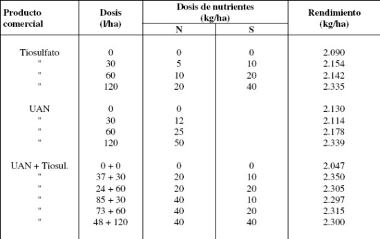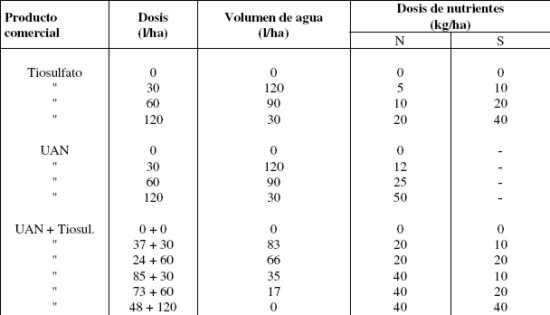 La fuente nitrogenada (N) fue UAN ( N:30 %- Densidad:1,3) y la nitrogenada-azufrada (N-S) fue tiosulfato de amonio (N:12 % - S: 26 %). Se aplicaron cuatro dosis de cada fuente y seis dosis de una mezcla de ambos productos a efectos de lograr diferentes combinaciones de Ny S (Cuadro 1).