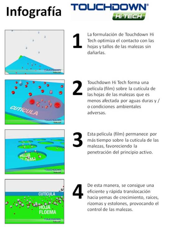 La exclusiva formulación de Touchdown Hi Tech es determinante para la cantidad de ácido que ingresará dentro de las malezas y potenciar la acción herbicida. Esta formulación combina ácido de glifosato, alta concentración de sal potásica y una mayor concentración de coadyuvantes que mejoran la absorción y difusión del ácido dentro de la planta sin dañar las células epidérmicas.