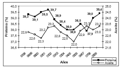 El contenido promedio de proteína y de aceite en soja de 1ª fue de 38,7 % y de