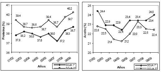 Fig. 2. Contenido de Proteína y Aceite en soja de 1ª y 2ª siembra. Campañas 2001/02 a