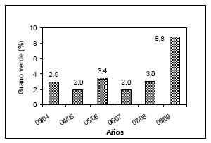 El porcentaje promedio de grano verde fue de 8,8% vs 3,0% de la campaña