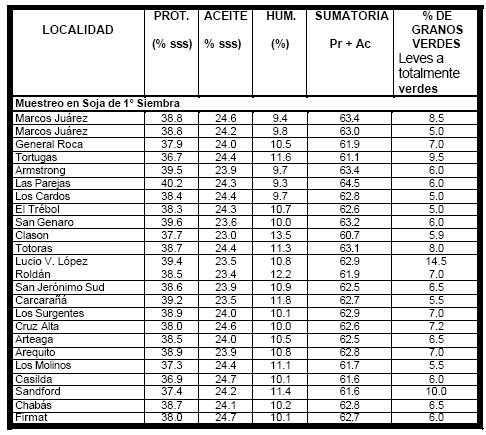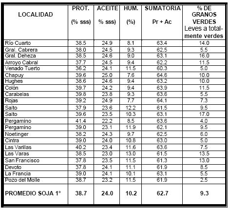 valores fueron de 24,9% -25,0% en soja de 1ª en la zona de Leones, Chapuy, Río