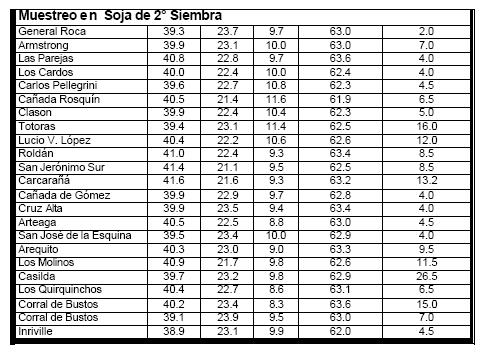 Cuarto y Rojas y el mínimo en soja de 2ª en Leones con 19,6%.