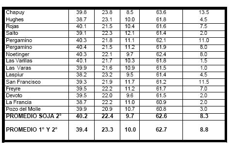 contenido de proteína promedio en soja de 1ª y 2ª siembra fue de 39,4%, con