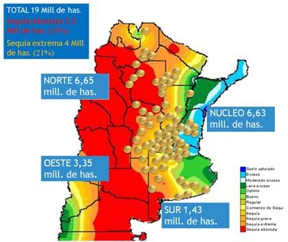 Si se considera específicamente el área que se estimó inicialmente para la siembra de soja -19 millones de hectáreas- se aprecia que aproximadamente el 40% sufre sequía actualmente. Esta situación se da en 3,5 millones de hectáreas con sequía absoluta (18% del total) y 4 millones con sequía extrema (21%).
