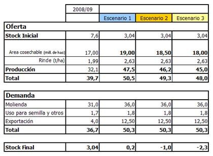 Si prevalecen los dos últimos escenarios planteados en el cuadro, la producción esperada no alcanzará para abastecer la demanda de la molienda, de la exportación y del uso para semilla (50,3 millones de toneladas).