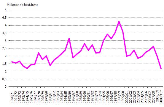 La superficie sembrada con girasol disminuyó sensiblemente en 2009, por las elevadas retenciones, por la falta de transparencia en mercados y pizarras, la necesidad de muy altos rindes para cubrir los costos y sequía al momento de la implantación. Todos estos factores provocaron una caída del 39% en la superficie sembrada respecto a la campaña 2008/09.