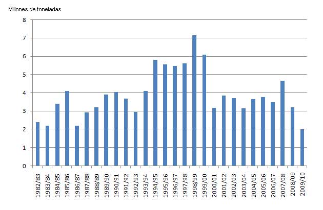 La producción estimada –del orden de 2 millones de toneladas (2,3 según los más optimistas)– está muy lejos de los 4,6 millones producidos en el ciclo 2007/08, y de los históricos 7,1 millones obtenidos en la campaña 1998/99 (gráfico 1).