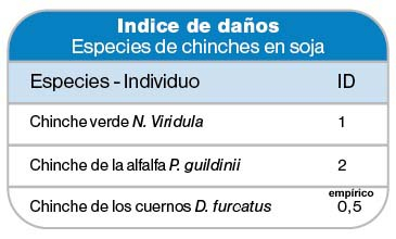 Como ej. del distinto potencial de daño entre especies de chinches en soja, se puede considerar el Índice de Daño de las principales especies, como herramienta de aproximación. Al respecto, considerando el valor 1 como índice del potencial de daño de un individuo de chinche verde N. viridula, el valor será el doble -índice igual a 2- para la chinche de la alfalfa P. guildinii, y una cuarta parte de éste o menor valor aún para el índice de la chinche de los cuernos D. furcatus.