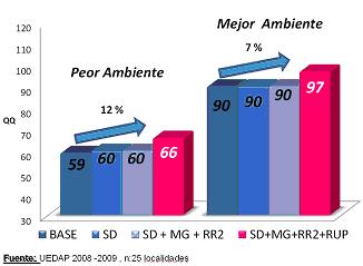 La principal conclusión es que la aplicación de tecnologías tiene un impacto más importante (mayor porcentaje de respuesta) en los ambientes de menores rendimientos. Este es un paradigma que la tecnología Dekalb® logró resolver: Los sistemas de producción Dekalb® generan una respuesta positiva en el rendimiento (más rendimiento y más estabilidad de los mismos) tanto en ambientes de buena producción como en ambientes de no tan buena producción.