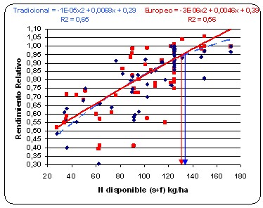 Figura 1.b Figura 1: Relación entre el Rendimiento Relativo al máximo y la disponibilidad de N (suelo + fertilizante) para: a) toda la red y b) diferenciado a través de genotipos –Europeo y Tradicional Las flechas verticales indican el nivel de N necesario para alcanzar un RR=0,95 del máximo.