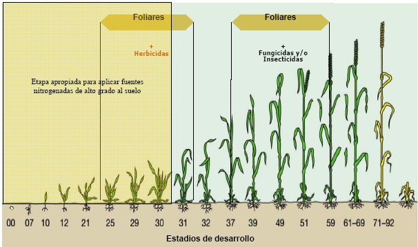 Sin embargo, el uso de fuentes tradicionales aplicadas al suelo podría ser una vía poco apropiada para realizar fertilizaciones nitrogenadas en forma tardía (Figura 1). Esto se debe al tiempo que demanda hasta su inserción en los procesos de la planta, ya que requiere de la incorporación a la solución del suelo, luego ser absorbido por las raíces, su transformación química y la traslocación final hacia los tejidos en crecimiento. Este proceso puede demandar varios días, volviendo al nutriente disponible en forma demasiado tardía, en una etapa en que se está definiendo el número de granos, componente principal de los rendimientos. En cambio, la aplicación foliar de N en dosis bajas podría resultar en un uso más eficiente gracias a su rápida absorción y metabolización, mejorando en poco tiempo los procesos reproductivos que se desarrollan en la planta.