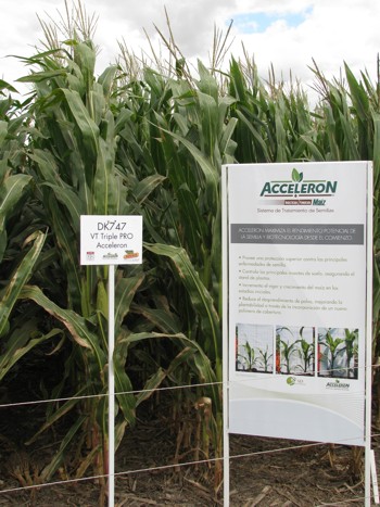 Cuando el nuevo maíz Genuity VT Triple PRO se lance al mercado, lo hará acompañado de Acceleron, un nuevo sistema de tratamiento de semillas que maximiza el rendimiento potencial del maíz y su componente biotecnológico desde el comienzo.