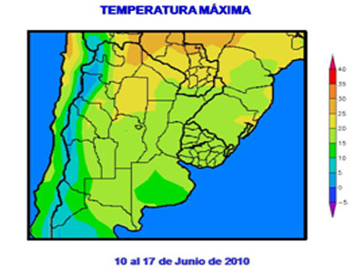 - El centro-este del NOA, el este de Cuyo, el sudeste de la Región del Chaco, la mayor pare de la Región Pampeana y la mayor parte de la Mesopotamia observarán temperaturas máximas entre 15 y 20°C, con un foco de valores menores de 15°C sobre las Serranías del Sudeste Bonaerense.