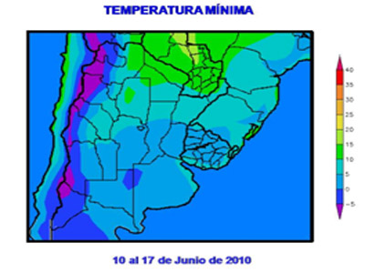 - El centro y el este del NOA, el sur de la Región del Chaco, el extremo norte de la Región Pampeana y el norte de la Mesopotamia observarán temperaturas mínimas entre 5 y 10°C, con leve riesgo de heladas localizadas.