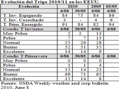 Las exportaciones semanales de trigo de los EEUU, fueron muy flojas generando un fondo débil para los precios. Para la semana concluida el 3/06/10 se reportaron como vendidas 118,3 mil toneladas (241,1 semana anterior), por debajo del rango esperado de 150 a 350 mil toneladas. El saldo acumulado alcanzó a 17% (15% a igual fecha del año anterior).