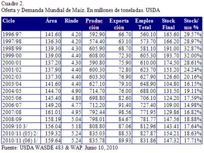 Con respecto al balance mundial de maíz 2010/11 según el USDA de junio indicó una producción de 835,8 millones de toneladas, exportaciones de 89,9, un uso total de 831,9 y cerraría con un stock mundial rebajado a 147,3 millones de toneladas (154,2 mes y 143,4 año anterior). La relación stock/uso quedaría en 17,7% (18,6% mes y 17,6% año anterior). Ver Cuadro 2.