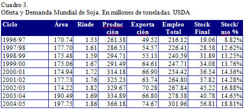 Con respecto al plano mundial se prevé para 2010/11 una producción de 249,9 millones de toneladas (259,2 año anterior), exportaciones de 88,2 (86,4 año anterior) y un uso total de 246,6 (235,2 año anterior). El balance mundial cerraría con un stock final de 67 millones de toneladas (66,1 mes y 65,8 año anterior). La relación stock/uso pasaría a 27,17% (28,8% mes y 27,8% año anterior). Ver Cuadro 3.