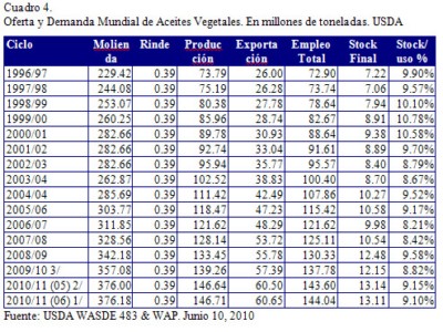 El balance mundial para los aceites vegetales temporada 2010/11 según el reporte del USDA de junio, cerraría con un stock final aumentado de 13,11 millones de toneladas (13,14 mes y 12,15 año anterior). Las relaciones de stock/uso siguen muy bajas cerrando a 9,10% (9,15% mes y 8,82% año anterior). Pese a estos indicadores hay que destacar que, respecto al año anterior, se prevé un crecimiento de la producción de 5,35%, comercio 5,7% y uso total de 4,54% y de los remanentes de 7,9%. Cuadro 4.