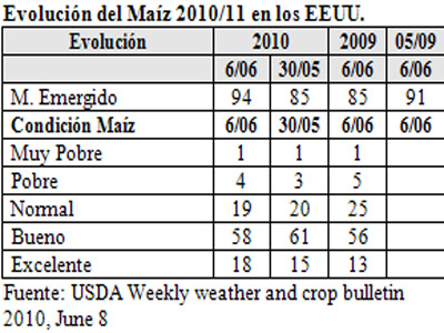 La evolución del maíz en los EEUU, resulta muy favorable. Al 6/06 esta emergido un 94% y (85% año anterior). La condición del cultivo se presenta muy buena siendo de 76% entre bueno a excelente (69% año anterior).