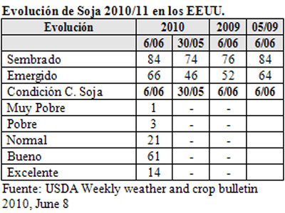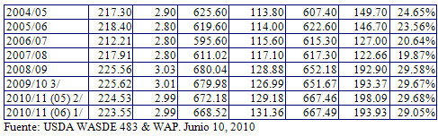 Según el informe de junio del USDA, la producción EEUU de soja 2010/11 se estimó en 90,1 millones de toneladas (90,1 mes y 91,4 año anterior), producto de un área proyectada en 31,2 millones de hectáreas (31,2 mes y 30,9 año anterior), con un rinde de 2,89 t/ha (2,89 mes y 2,96 año anterior). Se prevé exportaciones por 36,7 millones de toneladas (39,6 año anterior) y un uso total de 48,8 (50,9 año anterior). El balance de oferta y demanda de ese país cerraría 2010/11 con un stock de 9,8 millones de toneladas (9,9 mes y 5,0 año anterior). Esa casi duplicación llevaría la relación Sock/uso a 20,1% (20,4% mes y 9,9% año anterior). Esta duplicación del indicador fue el dato más bajista de la soja de la presente temporada.