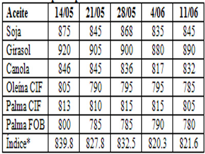 Durante la última quincena (28-05/11-06/2010), las cotizaciones de los aceites vegetales en la plaza de Rotterdam y en los principales puertos exportadores mostraron bajas en la primer semana y alzas que no se compensaron en la segunda, cerrando con mermas entre -07% a -2,4%. Las mayores bajas ocurrieron hasta el 4/06 mostrando luego y hasta el cierre una leve recuperación.