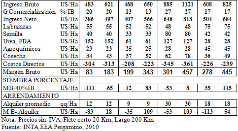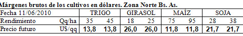La estimación de rentabilidad del trigo para la cosecha 2009/10, adoptando el precio futuro para enero-2011 de 138 u$s/t, y según los rendimientos de 35 y 45 qq/ha brindó márgenes brutos entre 83 y 183 u$s/t. (ver Cuadro). Como vemos los resultados para la nueva cosecha 2011 no fueron muy atractivos.