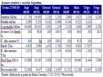 Según la Bolsa de Cereales de Buenos Aires, al 10/06/10 se estimaron coberturas en un 26,0% de la superficie proyectada que se sostiene de 4,2 millones de hectáreas. En caso de lograrse sería un 27% superior a la zafra precedente.