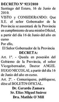 Desde el 2005, es gobernada por el abogado radical Gerardo Zamora, quien en los últimos años no escatimó en juntar denuncias en su contra, como la ganada a partir de la persecución sindical a trabajadores de salud, rumores de coimas en la compra del avión provincial, hospitales colapsados, pobreza y todo lo que ello implica. Y para no quedar fuera de tendencia, en línea con el Mundial de Fútbol, el dirigente sumó un nuevo haber en su prontuario: viajó a Sudáfrica a ver cómo jugaba la Selección argentina en su enfrentamiento con Corea bajo “misión oficial”, según el decreto 923, firmado el 16 de junio, un día antes del partido, y publicado recién hoy en el Boletín Oficial.
