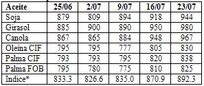 una ligera mejora, a 925/955 pesos por tonelada. El valor FOB del aceite de