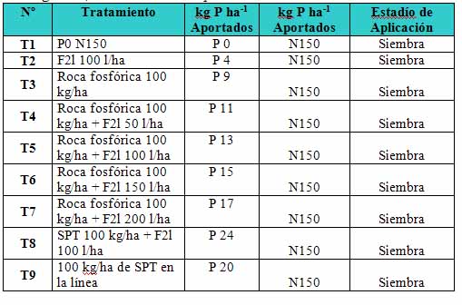 Las fuentes de fósforo evaluadas fueron Superfosfato Triple de Calcio (SPT, 0-20-0) en Pergamino y Nueve de Julio y MAP en San Antonio de Areco (11-23-0) como sólidos solubles, Roca fosfórica (0-9-0), y un fertilizante fosforado líquido provisto por Sudamfos SA, cuya concentración es 3.9 % P (9% P2O5) p/v. Como fuente de N se aplicó Urea granulada (0-46-0), llevando todos los tratamientos a la dosis final de 150 kg ha-1.